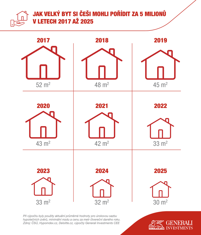 Ještě v roce 2020 si mohli zájemci s hypotékou ve výši pět milionů a měsíční splátkou kolem 20 tisíc pořídit v Praze novostavbu o velikosti 43 m². Dnes by za stejnou částku už jen 30 m² a měsíční splátka vychází přes 27 tisíc.